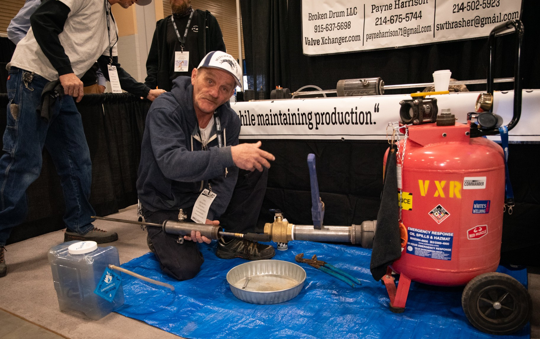 It is common in this situation for the oilfield manager to call in a “vacuum truck” – a large rig with a mobile storage tank on its back. The truck operator would normally hook a hose onto the leaking valve, open it up, then pump the oil from the storage tank onto the truck’s tank. Once the storage tank is drained, the hose is disconnected, and the valve is changed out. That accomplished, the oil is pumped from the truck and back into the storage tank. “I learned that even with a vacuum truck the process can take hours,” Bill recalled. “You must wait for the truck to show up, and depending on how busy the vacuum truck company is, you might wait one or two days. All the while, the valve is leaking oil and emissions. Once the truck arrives and the job is done, they send a bill that can be over a thousand dollars … to change out a single valve.” But what happens if a vacuum truck is not available, or the operator does not want to cover the expense? Enter the El Pasoan roustabout.